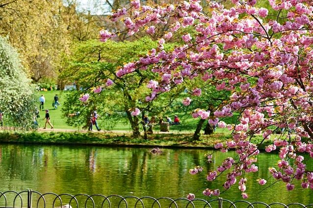 There aren’t many cherry trees in St James’s Park, but the ones it has are in a pretty special spot. Walk to the Buckingham Palace end of the lake, face toward Horse Guards, and you’ll find a cherry tree leaning over the water with Whitehall behind it.