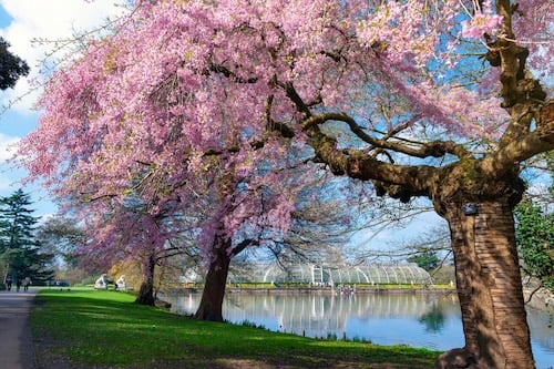 If you want the most concentrated blossom display in London, Kew is hard to beat. Start behind the Palm House, where multiple varieties of cherry tree line the path, then follow the route as it becomes Cherry Walk, a straight path running toward the Temperate House with deeper pink blossom on both sides. The Pagoda is visible at the end if you frame the shot right.